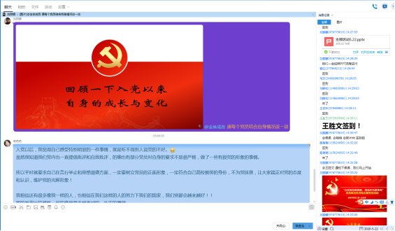 2020年5月22日下午,威廉希尔williamhill中文教工一支部在支部QQ群,通过视频会议形式,组织党员开展了线上党员政治生日“主题党日“活动,本次活动由支部书记刘丽娜主持,全体党员参加了活动。