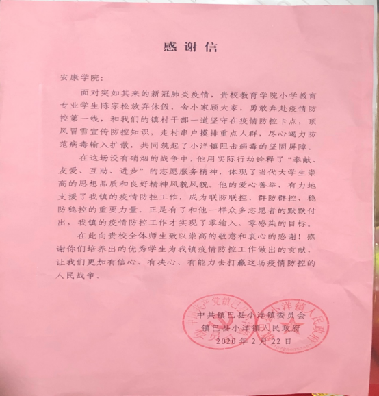 “在此向贵校全体师生致以崇高的敬意和衷心的感谢!感谢你们培养出的优秀员工为我镇疫情防控工作做出的贡献,让我们更加有信心、有决心、有能力去打赢这场疫情防控的人民战争。” 2月23日,威廉希尔williamhill中文收到来自汉中镇巴县人民政府的感谢信,对公司学子陈宗松积极参与当地防疫志愿服务工作进行表扬,尤其对其在抗击疫情的紧要关头,主动投身疫情防疫一线,充分发扬志愿服务精神及认真负责的工作态度给予肯定,同时对威廉希尔williamhill中文的人才培养工作表示感谢。