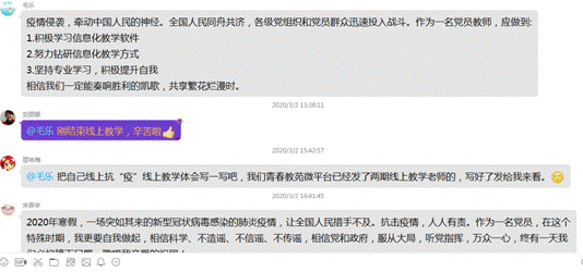 通知发出后,大家的积极性和参与度非常高,支部全体党员纷纷在QQ群里发表自己的学习感悟,互相讨论和交流学习心得体会。分别交流了近日追踪疫情报道、居家办公的感受,并结合自身工作学习生活,表达了虽不能奋战在抗击疫情的第一线,但对中国疫情防控的必胜信念、对中国特色社会主义制度的强大自信,以及对公司相关领域制度建设的关注和探索。