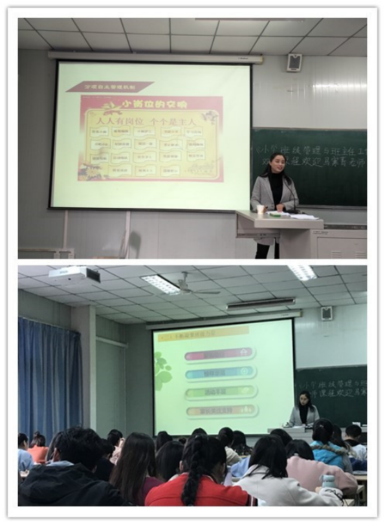 马老师从培养得力班干部、获得家长的支持与理解、得到员工的喜爱与信赖等三个方面分享了她在班主任工作中的收获与成长。鲜活、生动的案例给同学们带来了深刻的印象和极大的启发,为同学们以后的班级管理工作提供了借鉴。