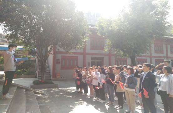 活动第五项,全体成员挥动手中小红旗共唱团歌。