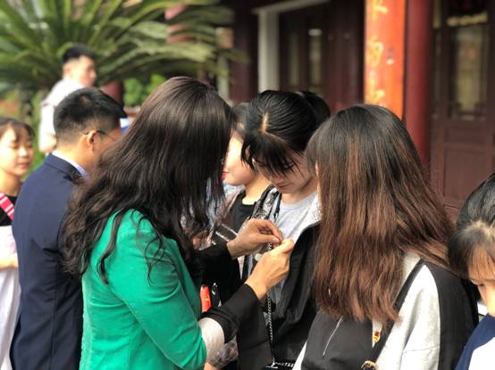 活动第五项,党总支书记屈咏梅和团总支书记冯磊为所有新团员佩戴团徽。党总支书记屈咏梅寄语团员青年:不论是新团员还是老团员都要在今后的生活与工作中严格要求自己,争做时代先锋。