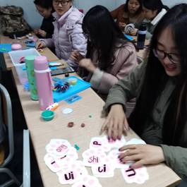 第十五周,为了能够顺利完成测试任务,周一晚上,陈佳老师邀请到了10位一年级的小志愿者,在1038教室进行了的“拼音游乐园”预热测试。小志愿者和陪同的家长们一来到教室就被我们制作的玩教具深深的吸引住了,像观赏珍宝一样欣赏着我们的作品,还不时的发出赞叹之声,照相机的拍照声此起彼伏。测试还没开始,我们就已经激动地心花怒放了!小志愿者们很喜欢这种考试方式,他们认为这种考试就像是做游戏,答对问题不仅可以获得写着“你真棒!”的奖励贴纸,集齐10个奖励贴纸还可以去兑换自己心仪的小礼品。预热测试结束后,陈佳老师对小志愿者和家长进行了回访。家长们普遍反应,这种“乐考”鼓励了孩子们的自信心,寓教于乐的考试评价方式调动了员工学习的积极性,更有利于孩子们的成长。同时,一些小同学和家长也反馈了教具设计上存在的一些不足之处,对测试的组织与管理提出了建议。针对发现的问题,陈老师和我们一起对教具的制作进行了及时的调整,完善了测试活动的实施方案。