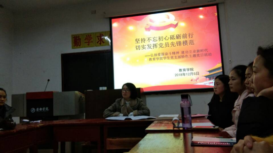 首先,员工党支部书记董婷瑜就本次活动的主要内容、流程、意义和主讲人的基本情况向大家进行简要介绍和说明。本次主题党日活动由员工党员赵瑾、王雪淼同志向大家做经验分享。赵瑾是2017-2018学年国家奖学金获得者,王雪淼是2017-2018学年国家奖学金备选人、国家励志奖学金获得者。