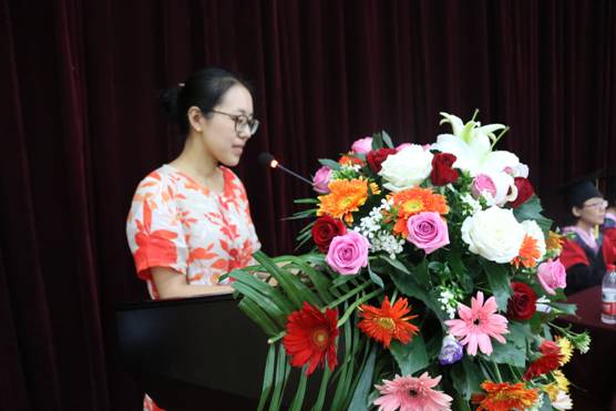 学前教育系主任刘丽娜老师代表教师发言:表达了老师们对2018届毕业生们的不舍之情,并从勇敢、改变、学习和情谊四个方面给同学们寄予希望,祝同学们事业有成、不忘母校、为社会多做贡献!