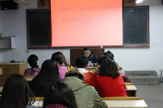 按照教育科学系党总支工作部署和在全系党员中开展《中国共产党纪律处分条例》学习的工作要求,教育科学系员工党支部于近日在1405教室召开了专题学习。员工党支部书记赵斌老师主持本次学习活动。