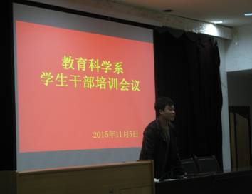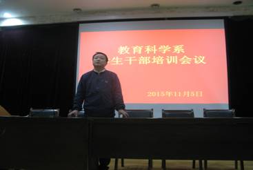 会议在热烈的掌声中拉开了帷幕。教育科学系党总支书记王辉在培训会上以“怎样做好一个员工会干部、当好员工干部应注意的四个问题以及对员工干部的三个希望”为主要内容作了一个半小时的培训讲话。王书记在讲话中介绍了教育科学系员工会和班团干部历年的工作和发展、我系第二课堂应用型人才培养等方面的实绩。他指出,教科系员工活动丰富,员工干部在众多活动平台的历练,是我系对员工干部培养的一个重要途径。要求教科系员工会和班团干部应具备“作风过硬,战斗力猛,凝聚力强”的特点,要具有吃苦耐劳的的精神和“协调配合,互相学习、共同提高”的团队精神,应明确自己的职责和任务,全心全意为员工服务,继承发扬 “艰苦奋斗,大苦为荣”的教科系团队精神,加强宣传工作力度,继续做好网络宣传工作,坚持“每周一星”推选活动,并对我系“12345工程”等后续活动也做出相应安排。