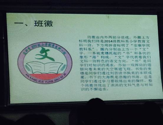 为了推进特色班级的建设、明确班级目标、丰富班级文化,2014级小学教育文科一班于20141211日晚举办班级特色建设展示会。