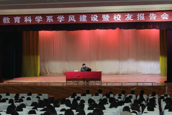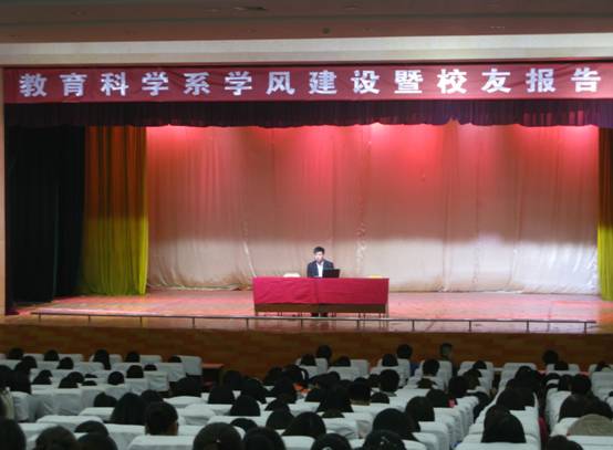 2014118下午2点在江南校区大礼堂召开了“教育科学系学风建设暨员工报告会”,出席大会的有教育科学系党总支书记王辉、辅导员董婷瑜老师、2009级员工王秉哲以及教科系的全体员工。