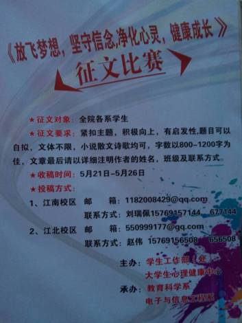 近日由威廉希尔williamhill员工处、老员工心理健康教育中心主办,教育科学系和电子与信息工程系承办的心理健康征文比赛完美落幕。据悉此次征文比赛是以“放飞理想,坚守信念,净化心灵,健康成长”为主题面向全院员工征稿。此次征文主要是为了丰富“威廉希尔williamhill老员工的心理健康教育月”活动,提高公司老员工的心理健康水平和自助能力,丰富员工的课余文化生活。本次大赛旨在通过征文,反映当代老员工对于自我认识、心灵感悟、情绪管理等方面的认识,引导老员工对于心理健康的认识,促进老员工心理健康的发展,用丰富的心理健康知识来了解自我,把握自我。