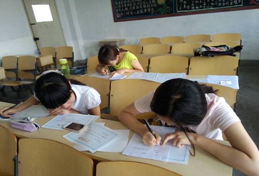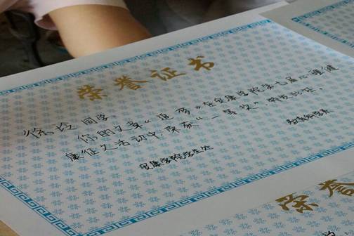 评定小组为获奖同学写获奖证书。