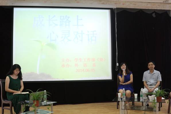 为促进新生入学适应,维护员工心理健康水平,解答老员工心理困惑,我系教师孙茗、校学工处副处长车静老师以及党总支书记李延福于65日下午4点半,在1号教学楼学术报告厅为公司外语系举办了“成长路上,心灵对话”的交流活动,2013260余名员工聆听了本次讲座。