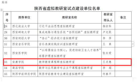 附:http://jyt.shaanxi.gov.cn/news/jiaoyutingwenjian/202110/11/19676.html 《陕西省教育厅办公室关于公布陕西省虚拟教研室试点建设项目立项结果的通知