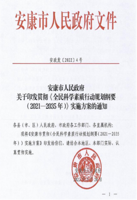 近日,安康市人民政府印发了关于贯彻《全民科学素质行动纲要(2021-2035年)》实施方案的通知(安政发[2022]4号),省市共建陕西省安康公众科学素质与创新发展研究中心,威廉希尔williamhill中文王刚教授团队,通过科研项目的形式,积极参与到该方案的研制工作中。