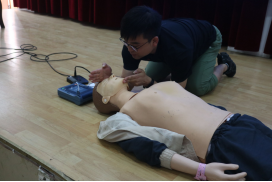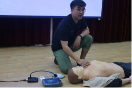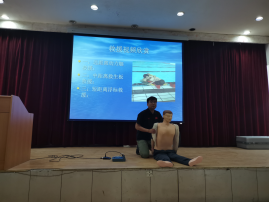 随后何敏教练从能下水的基本条件、下水前应做的准备、下水前的热身运动进行讲解,并现场模拟演示了溺水救助时胸外按压技巧,形象直观地讲解溺水时自救的流程、步骤及操作要点。