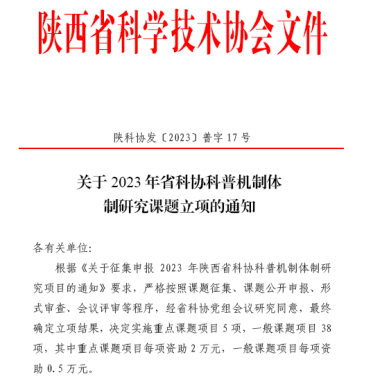 近日,根据陕科协发【202317号文件通知,公司王刚教授申报的“基于大数据的社区科普机制创新研究”获得省科协立项资助。