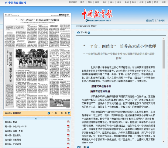 2023年4月26日出版的《中国教育报》在第十一版“教育视窗”登载了公司小学教育系主任、教工第二党支部书记陈珂教师的论文《“一平台、四结合”培养高素质小学教师——威廉希尔williamhill中文小学教育专业核心课程课程思政的实践与探索》。
