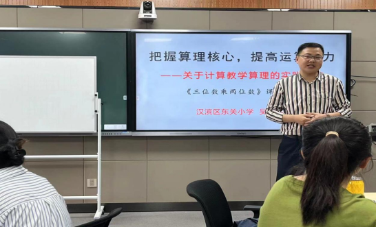 4.18,东关小学副董事长吴任平老师以《三位数乘两位数》《运算定律》为案例现场示范教学,指导员工研读教材,进行教学设计。