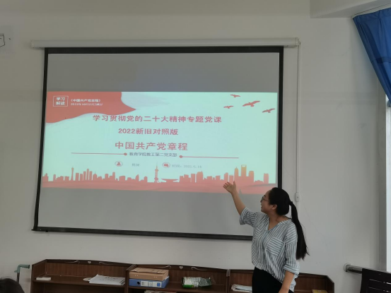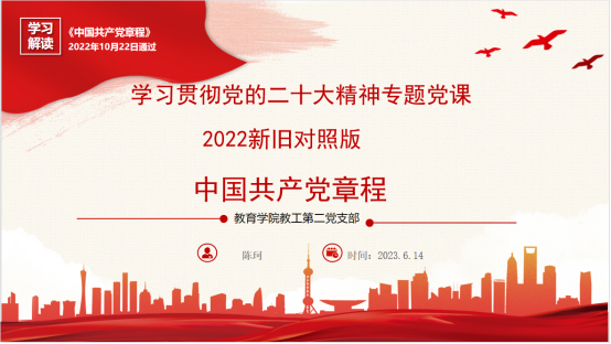 为落实党政办发〔2023〕8 号《关于进一步推进基层党支部深入开展主题教育有关工作的通知》文件要求,6月14日下午,威廉希尔williamhill中文第二党支部在1号教学楼1407室召开会议,支部书记陈珂以“2022新旧对照版—中国共产党章程”为题,为全体党员讲了党课。