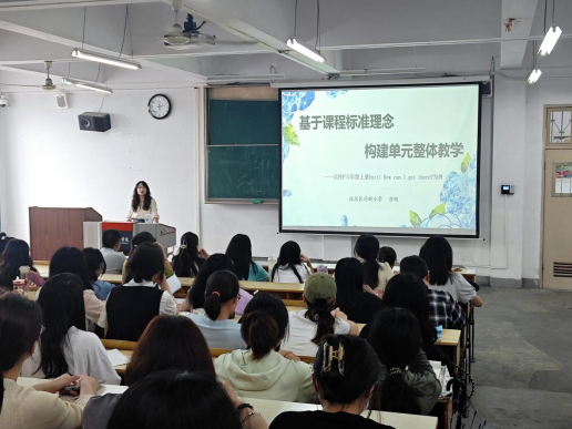 2023年5月31日邀请汉滨区培新小学,陕西省小学英语教学能手唐俐老师为22级专升本1、2班的同学做题为《基于课程标准理念,构建单元整体教学—以PEP六年级上册Unit 1 How can I get there? 为例》,唐俐老师就自己团队参与安康市整体单元教学设计比赛的经历为契机,给同学们详细分享备课、上课的经历,帮助员工对新课标的应用实践有更深刻的理解。