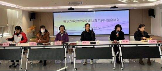 走访结束后,王经理一行、幼儿园的各位领导、指导教师们和全体实习生齐聚报告厅展开座谈。在副园长梁娜的主持下,座谈会在同学们青春活力的韵律操表演中拉开序幕。后勤副园长沈青梦介绍实习生生活保障情况;保教主任吴小爱小结三个月实习情况;园长张慧文介绍第四个月实习安排,宣布指导教师结对名单;实习生代表张瑞发言;指导教师代表与实习生代表签订指导协议。