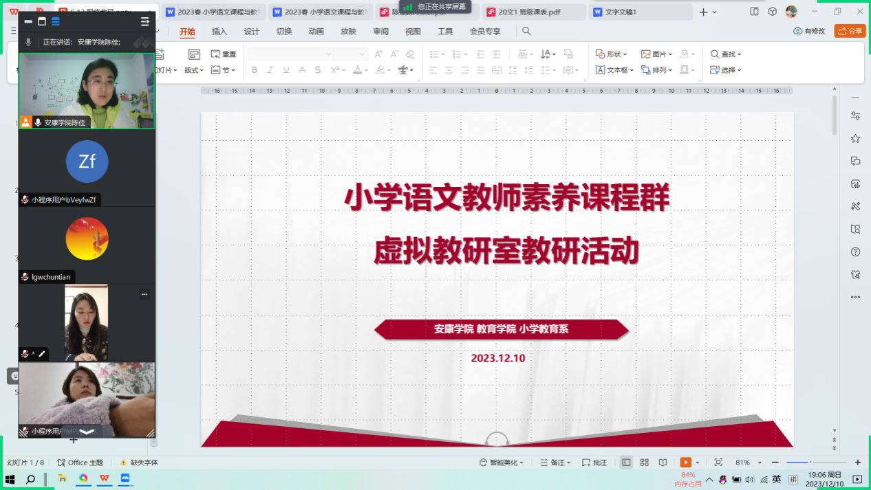 1210日晚700,小学语文教师素养课程群利用虚拟教研室开展了双师课教学线上教研活动。线上教研有课程负责人陈佳老师主持,“小学语文课程与教学”课程双师团队全体教师参加了会议。