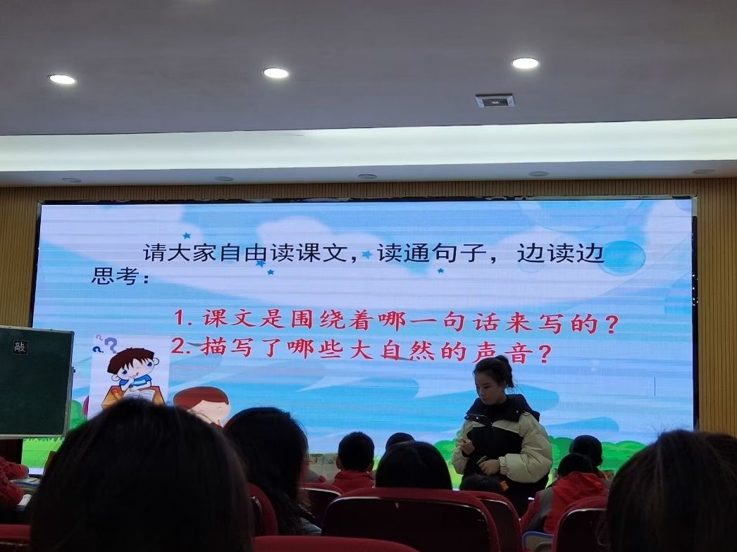 王老师以谜语导入,引起员工兴趣,通过让员工聆听各种大自然的声音,自然而然引入课题。分别从风、水和动物三个方面描写了大自然声音的丰富美妙,王老师采用多种教学形式让员工尽情的读,并辅以各种教学手段让员工悟情、悟景、悟得,让他们在主动积极的思维和情感活动中,走进大自然、体验大自然、发现大自然,拥有美的感受。