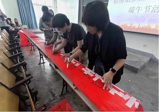 活动现场,师生们有序在主题条幅上签名留念,写下“端午安康”、“传承民俗”等真挚祝福,以笔墨传递节日温情。随后,端午习俗分享会正式拉开帷幕。同学们踊跃发言,结合自身经历,生动讲述家乡包粽子、制香囊、系五色丝线等传统习俗,现场气氛热烈。老师们也参与互动,从历史典故、文化寓意等角度深入解读端午文化。大家积极交流、相互学习,在思想碰撞中深化了对中华优秀传统文化的认同感。活动最后,王璐带领辅导员们为员工分发粽子,使同学们深入感受节日氛围。
