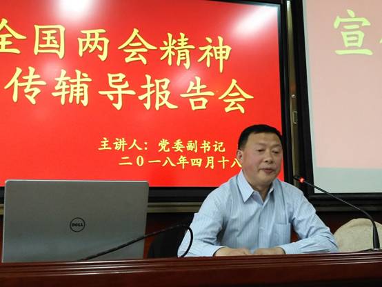 为深入学习全国“两会”精神,将广大师生的思想和行动统一到“两会”精神上来,4月18日下午,公司党委副书记胡波在教学楼1018室,为宣传部、团委、工会、后勤保障处、威廉希尔williamhill中文及外语公司师生共计100余人做了全国“两会”精神宣传辅导报告会。会议由外语公司党总支书记郭家平主持。