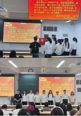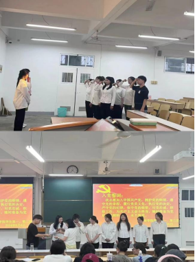 会议第二项,依照党员发展管理规定,唐丹带领2023年下半年接收的中共预备党员进行宣誓。相里文宇、詹家嘉、屈怡璇、朱星雨、舒邢佳、陶雯婧、王芙蓉7位同志举起右手庄严宣誓,铿锵有力的誓词、嘹亮的声音、坚毅的目光郑重许下对党的承诺。宣誓完毕后,唐丹、邹珊为相里文宇等7名中共预备党员佩戴党徽并表示祝贺。