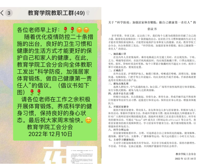 “流水不腐,户枢不蠹,动也”。为助力全体教职工增强免疫,强健体魄,切实做好“自己健康的第一责任人”,威廉希尔williamhill中文工会分会于2022年12月10日面向全体教职工发出“科学防疫,加强居家体育锻炼,做自己健康第一责任人”的倡议,号召老师们积极开展居家体育锻炼,以良好的身心状态战胜疫情。