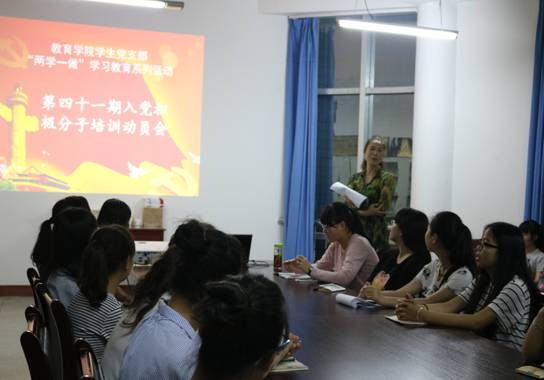 赵斌宣读了第41期入党积极分子的学习安排、要求和纪律。党总支书记屈咏梅为入党积极分子作了动员讲话,她提出:入党积极分子要在培训学习中应带着“三个目的”去学习。一、达到全面深刻的认识党,深入了解党的历史,扎实掌握党的基本理论的目的;二、入党不仅是一种政治诉求,更是一种责任和担当,要在学习中达到不断端正入党动机的目的;三、结合 “两学一做”学习教育,在培训学习中达到了解党员的标准、知道如何成为一个合格的党员的目的。屈咏梅最后强调:入党积极分子要以身作则、率先垂范,对自己高标准、严要求;认真完成学习任务,认真撰写学习心得;要从思想上入党真正落实到行动上入党。
