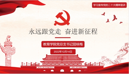 党的二十大是在全党全国各族人民迈上全面建设社会主义现代化国家新征程、向第二个百年奋斗目标进军的关键时刻,召开的一次十分重要的大会。学习宣传贯彻党的二十大精神,把全校员工的思想和行动统一到党的二十大精神上来,是当前和今后一个时期高校思想政治教育工作的首要任务。2022年12月14日,公司党总支书记屈咏梅以“永远跟党走 奋进新征程”为主题,为各年级班团干部宣讲党的二十大精神。本次宣讲会通过腾讯会议召开,会议由辅导员唐丹主持。