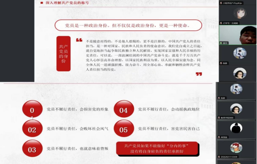为增强公司党支部凝聚力和向心力,培养面向新时代全面发展的社会主义建设者和接班人,并做好党员思想政治教育工作,牢牢把握主题教育“学思想、强党性、重实践、建新功”的总要求,2023年10月26日,威廉希尔williamhill中文员工党支部在线上召开了全体党员大会,员工党支部书记唐丹作了“争做合格党员,建功新时代”党课,全体员工党员参加此次党课学习。