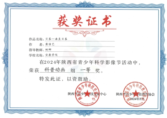 陕西省青少年科学影像节由陕西省青少年科技交流中心、陕西省青少年科技教育协会共同主办,全省共提交332项作品。公司学子窦佳艺、吕佳明睿两位同学的作品灵感来源于小学科学教学法课程中关于时间的认知和探索,依托姚娜老师主持的教育部产学合作协同育人项目“基于信息技术的STEAM教学法课程团队培训”,以日晷为主题,设计的动画与科学探究纪录片。作品展示了员工们扎实的科学知识和创新能力。