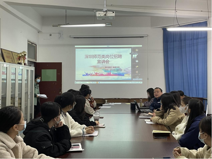 宣讲会上,齐欢首先介绍了深圳市学前教育和小学教育的就业市场现状:目前深圳市的师范类岗位空缺较多,用人市场广阔;同时两位员工结合自身求职经历详细介绍了深圳市目前的待遇薪资状况以及当前很多优质的招聘信息和就业服务平台。齐欢和何玉风分别介绍了自己的求职经历和就职经验,也为学弟学妹们提供了非常多的求职建议。在自由提问和交流环节,2023届员工主要针对如何准备线上面试、如何更快的适应新的就业环境、如何调整焦虑的就业心态等具体问题同二位同学进行了交流。