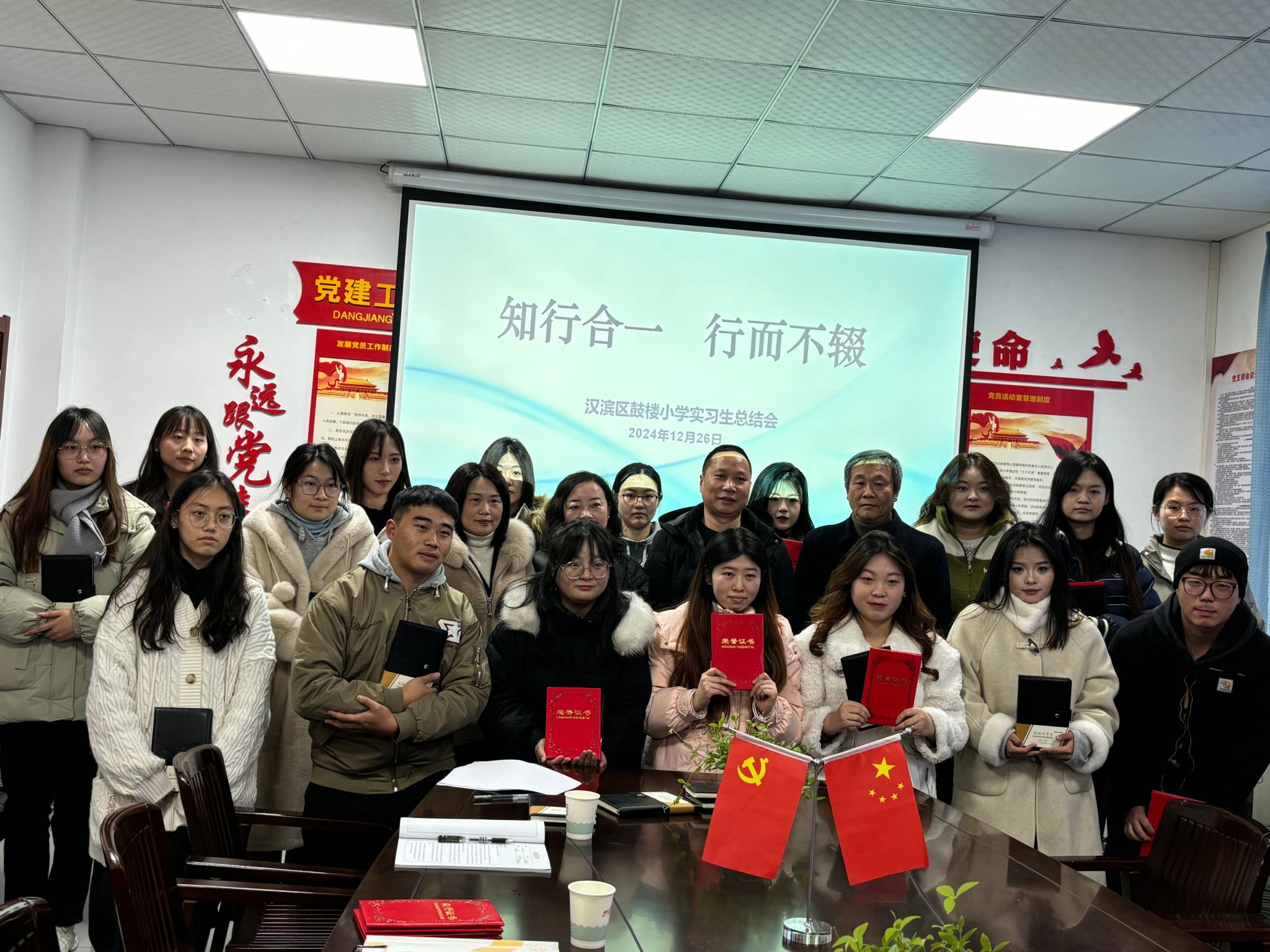 会议由实习生杨昊宇主持,实习生代表杨晨和高欣萌首先发言,他们分享了实习期间的点滴收获、成长感悟以及难忘经历,让大家感受到了实习生们在这段时光里的充实与蜕变。紧接着,实习指导教师张冰茹发言,总结了指导教师的辛勤工作,同学们实习期间的良好表现、巨大收获,为后续实习工作提供了宝贵经验。实习带队老师黄老师和常老师对古楼小学领导和教师对实习工作的支持,对实习过程的精心安排与指导表示感谢,对实习生遵守纪律、谦虚学习、团结友爱的良好表现予以表扬。鼓楼小学领导、教师和实习带队教师共同为优秀实习生颁发奖状,为全体实习生颁发实习纪念品,并合影留念。会议最后,鼓楼小学周书记总结讲话。周书记着重强调了鼓楼小学多次荣获区、市、省、国家级诗文校园、标兵公司等荣誉,同时指出公司向来严管教师队伍,并且一直高度重视对实习生的管理以及实习工作的开展,彰显出公司对人才培养的用心与担当。