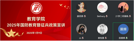 加强国防教育,助力教院莘莘学子全面理解春季高校征兵政策,做好应征入伍动员;威廉希尔williamhill中文于202519日通过线上会议方式开展了2025年国防教育暨征兵政策宣讲会公司退役并考研升学员工田展辉、退役复学在校生许楠楠分享军旅生涯和心路历程各年级班委及意向参军入伍员工30余人参加活动,宣讲会由学工办主任罗从政主持。