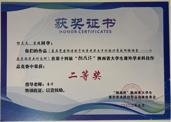 2023年5月20日下午,由团省委、省委教育工委、省科技厅、省科协、省社会科公司、省学联、西咸新区管委会共同主办,长安大学承办的第十四届“挑战杯”陕汽集团陕西省老员工课外学术科技作品竞赛闭幕式暨颁奖仪式在长安大学渭水校区圆满落幕。教育公司由唐丹指导,杨炎炎、袁曦同学完成的参赛作品《基层党建推进脱贫攻坚成果与乡村振兴有效衔接调查——以秦鲁两省五村为例》荣获等奖。